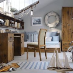 Модульная система «Индиана» выполнена из высококачественных, экологически чистых и безопасных материалов – ЛДСП, МДФ. Металлическая фурнитура произведена в Германии фирмой Hettich. Ручки и оковки по углам изделий имеют оригинальную форму и придают мебели антикварный вид. Яркое впечатление производят варианты цветового решения коллекции: темный «дуб саттер» и светлый нежный оттенок «сосна каньон».