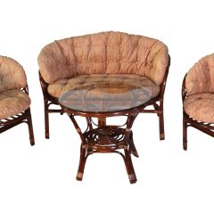Комплект из натурального ротанга, состоящий из дивана, двух кресел и круглого столика со стеклом.